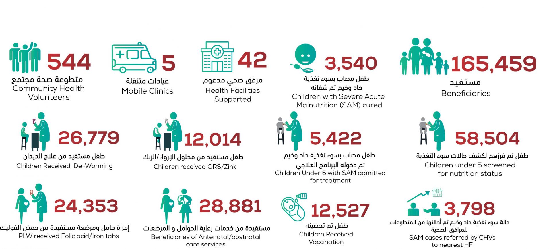 يهدف مشروع الصحة والتغذية التكاملي إلى المساهمة في خفض معدلات الإصابة بالأمراض والوفيات بين الأطفال دون سن الخامسة والنساء الحوامل والمرضعات في محافظات أبين وشبوة والضالع وحضرموت و تعز و ذلك بالشراكة مع منظمة الطفولة اليونيسف