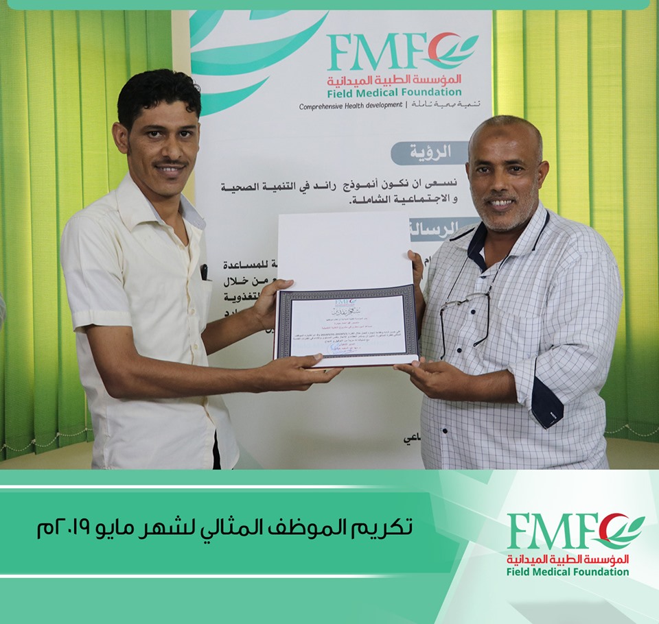 كرمت إدارة المؤسسة الطبية الميدانية الاستاذ منصور محمد احمد حيدره كموظف مثالي لشهر مايو 2019 .