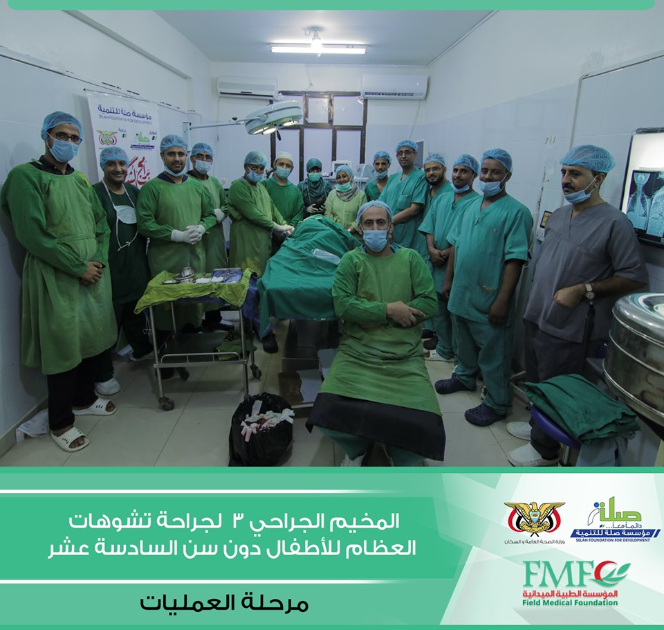 بتمويل من مؤسسة صلة للتنمية Selah Foundation for Development و برعاية وزارة الصحة العامة و السكان دشنت المؤسسة الطبية الميدانية المرحلة الثانية “مرحلة العمليات ” من المخيم الجراحي الثالث لجراحة تشوهات العظام للأطفال دون سن السادسة عشر .