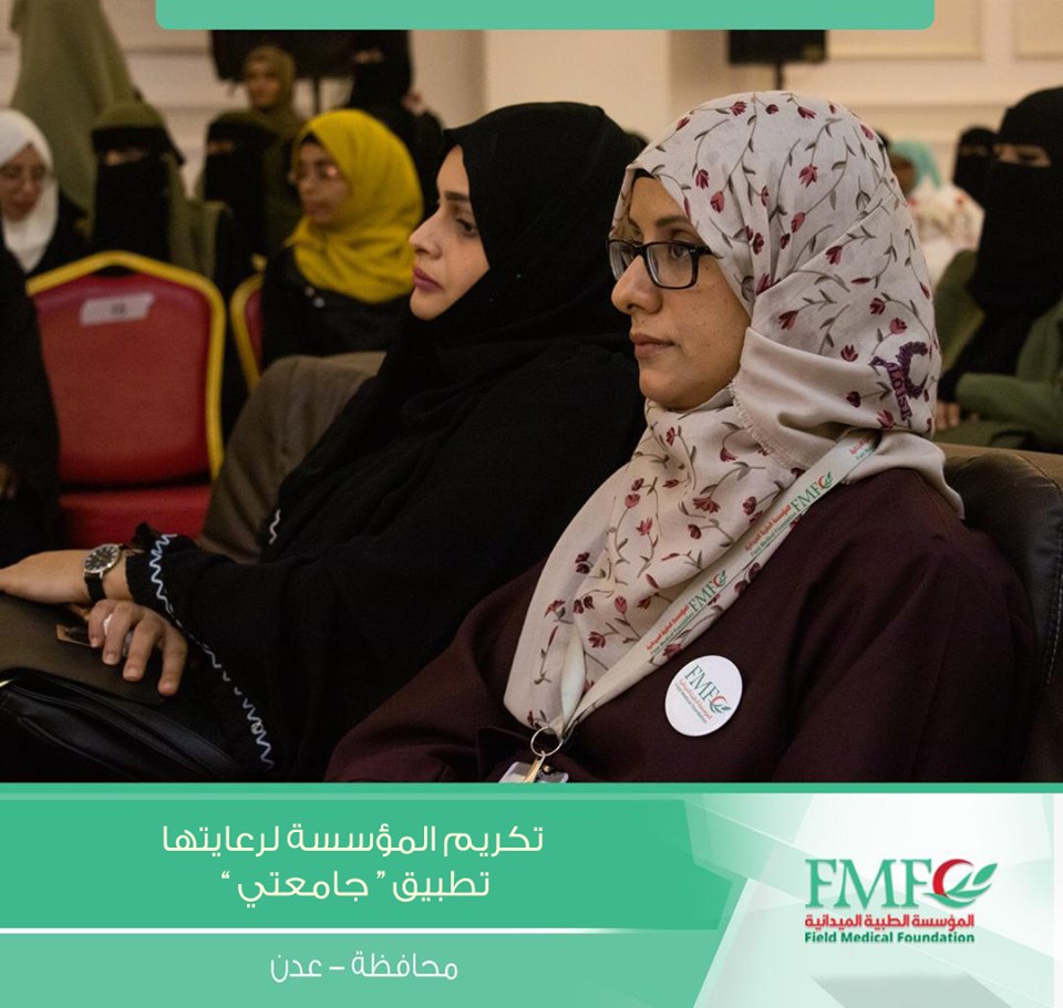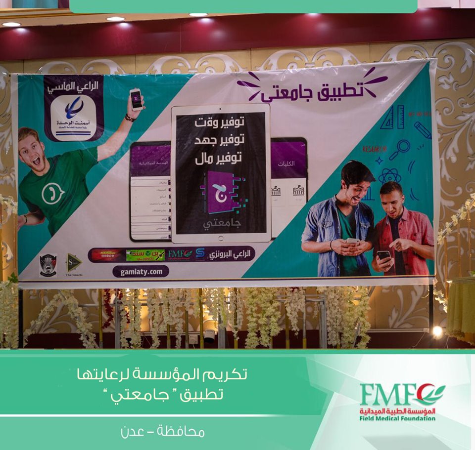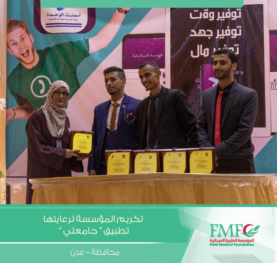 كرم القائمين على مشروع تطبيق جامعتي بكلية الهندسة جامعة عدن المؤسسة الطبية الميدانية لرعايته لهذا المشروع النوعي والاول في المحافظة .
