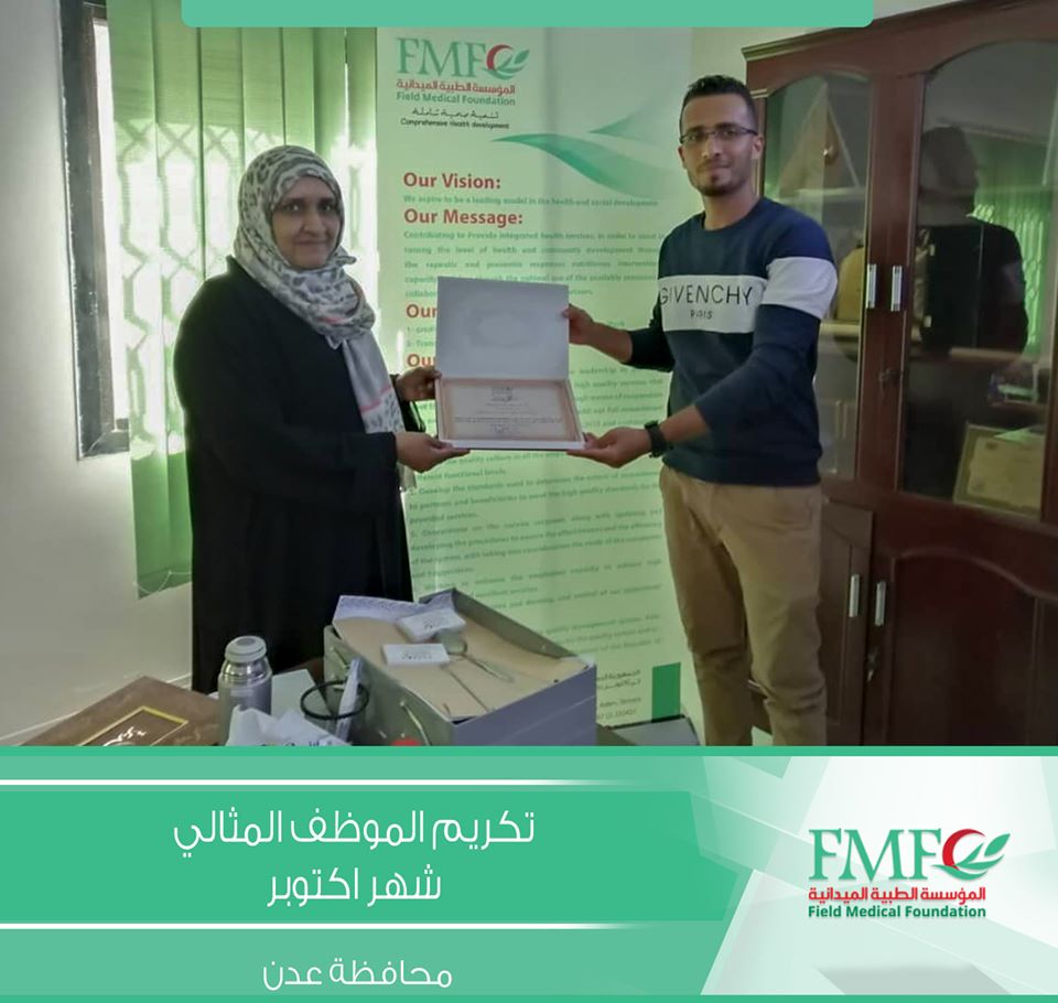 بجائزة الموظف المثالي لشهري اكتوبر ونوفمبر 2019 وذلك نظير أدائهما الوظيفي المتميز وجهدهم الدؤوب في تأدية المهام و مساعدة الطاقم ، و يأتي هذا التكريم الشهري ضمن سياسة التشجيع للكادر الوظيفي وإذكاء روح التنافس بينهم و تقديراً من إدارة المؤسسة للإنجازات المثمرة، والأداء المتميز وذلك باعتبار أن الكادر البشري عنصر أساسي في تقديم الخدمات في الجهاز المؤسسي .