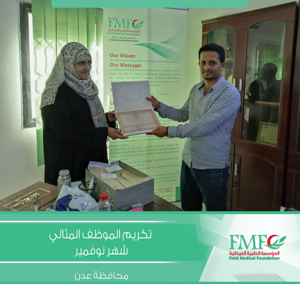 بجائزة الموظف المثالي لشهري اكتوبر ونوفمبر 2019 وذلك نظير أدائهما الوظيفي المتميز وجهدهم الدؤوب في تأدية المهام و مساعدة الطاقم ، و يأتي هذا التكريم الشهري ضمن سياسة التشجيع للكادر الوظيفي وإذكاء روح التنافس بينهم و تقديراً من إدارة المؤسسة للإنجازات المثمرة، والأداء المتميز وذلك باعتبار أن الكادر البشري عنصر أساسي في تقديم الخدمات في الجهاز المؤسسي .