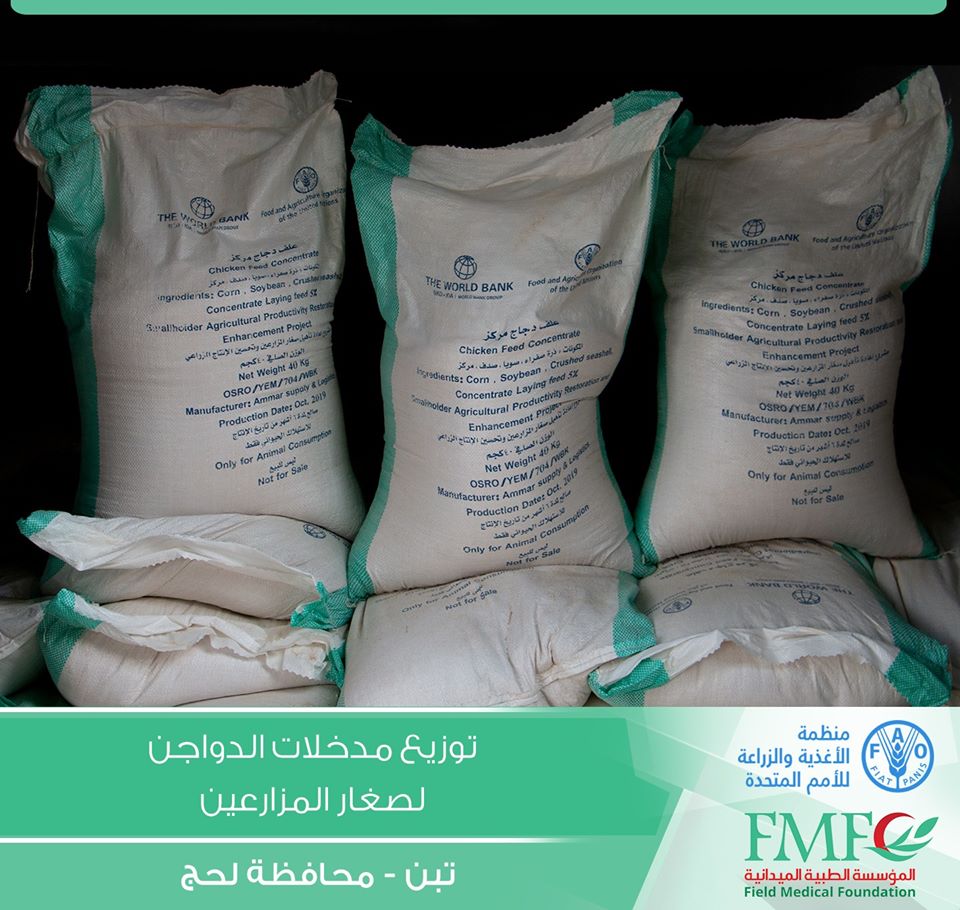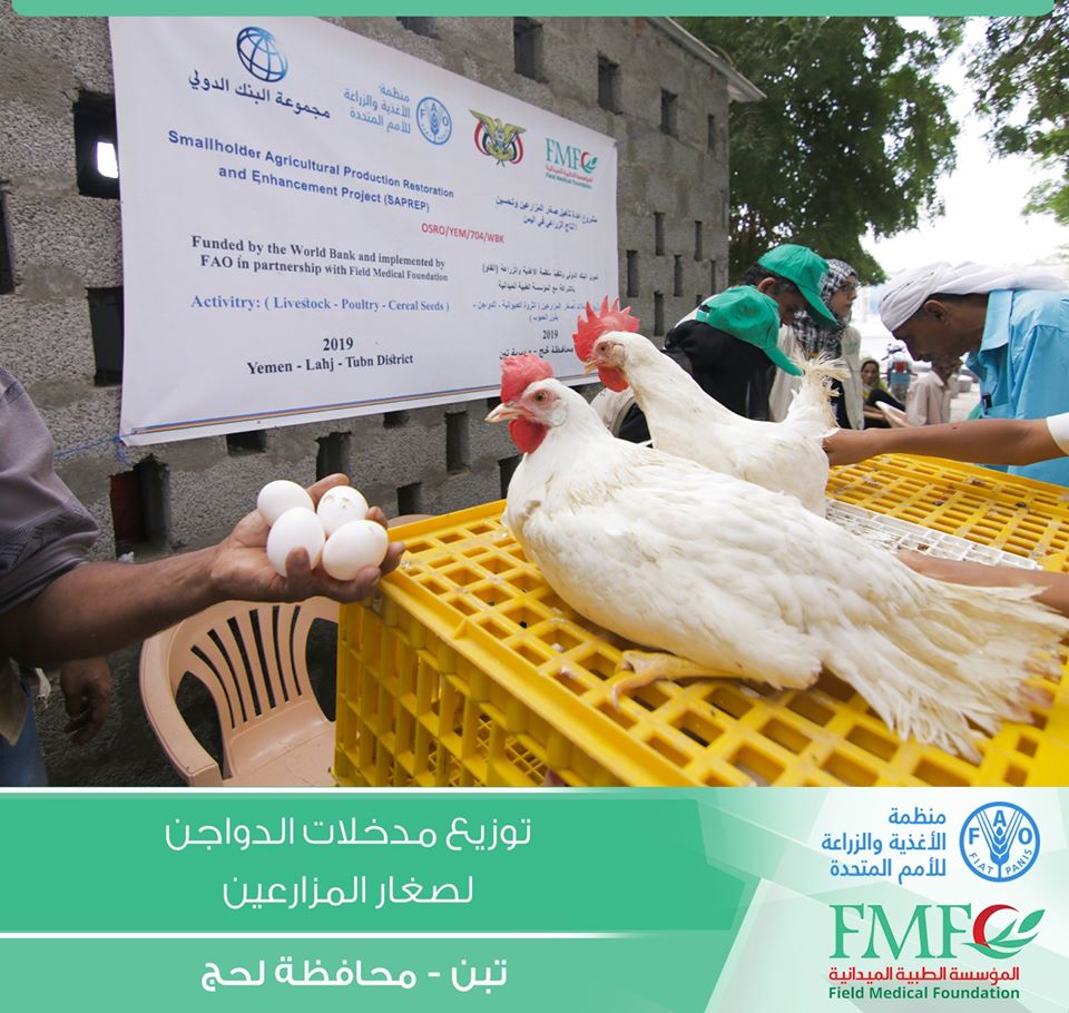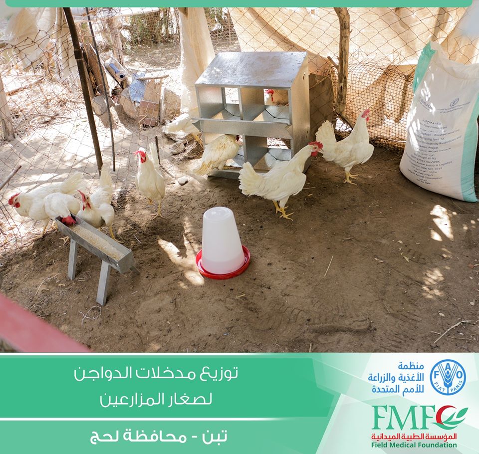 بتمويل من منظمة الأغذية والزراعة للأمم المتحدة ” فاو ” (Food and Agriculture Organization of the United Nations (FAO وزعت المؤسسة الطبية الميدانية FMF المدخل الثالث ” الدواجن ” وذلك ضمن أنشطة مشروع دعم صغار المزارعين في محافظة لحج مديرية تبن .