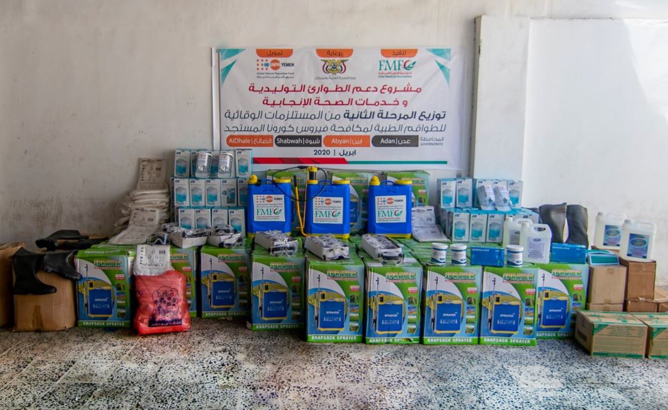 بتمويل من صندوق الأمم المتحدة للسكان UNFPA دشنت المؤسسة الطبية الميدانية FMF المرحلة الثانية لتوزيع المستلزمات الوقائية من فيروس كورونا المستجد COVID19 لـ 22 مركز صحي في محافظات عدن و الضالع و أبين و شبوة ، و تشمل معدات مكافحة العدوى و مواد التعقيم و معدات الحماية الشخصية .