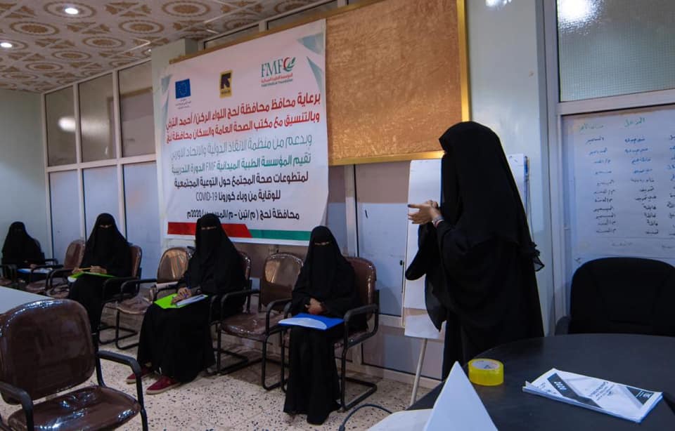 دشنت المؤسسة الطبية الميدانية اليوم الاثنين دورة تدريبية لمتطوعات صحة المجتمع في محافظة لحج حول التوعية المجتمعية للوقاية من فيروس كورونا COVID19