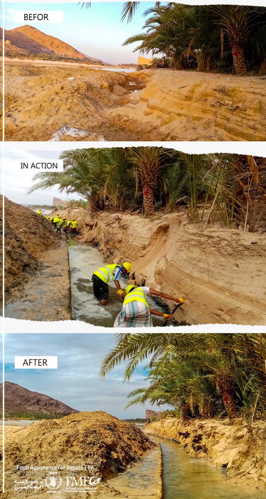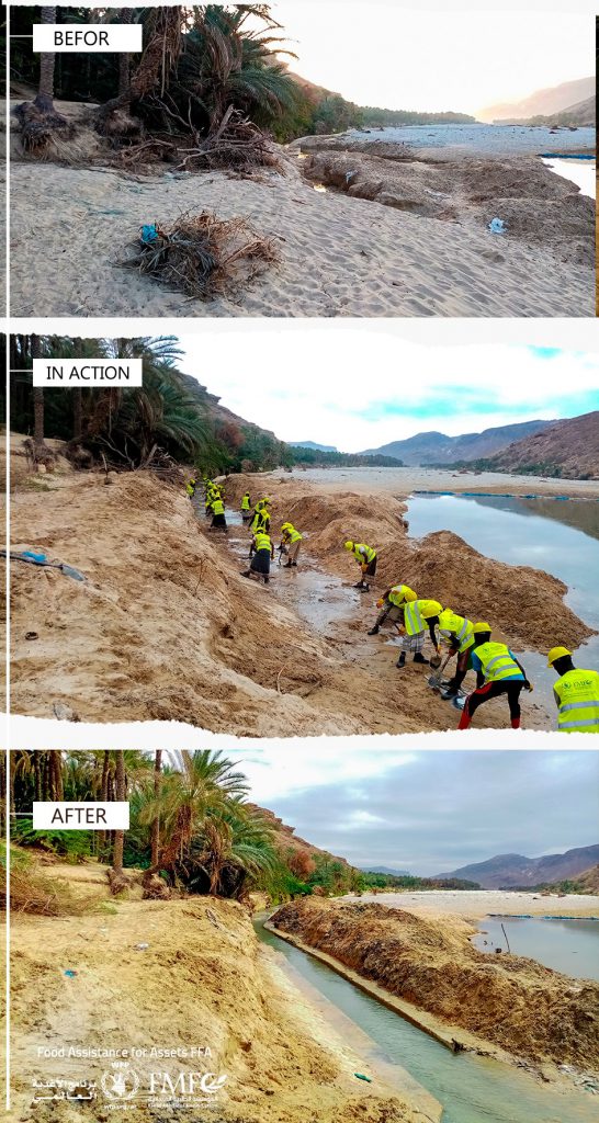 بالشراكة مع برنامج الأغذية العالمي World Food Programme نعمل حاليا عبر مشروع المساعدات الغذائية مقابل تأهيل الأصول الى مد يد العون لمديريتي حجر و ساه بمحافظة حضرموت عبر إستصلاح و تآهيل قنوات الري و إعادة تأهيل الأراضي وتطهيرها من الحشائش الضارة واجتزاز الغطاء النباتي المتضخم في المناطق المهجورة، وإزالة الحطام من المناطق الزراعية الأمر الذي سيساهم في استصلاح مئات الآلاف من هكتارات الأراضي المتدهورة لتصبح صالحة للزراعة مرة أخرى الأمر الذي سيحسن الأمن_الغذائي والقدرة على الصمود على المدى البعيد في هذه المجتمعات.