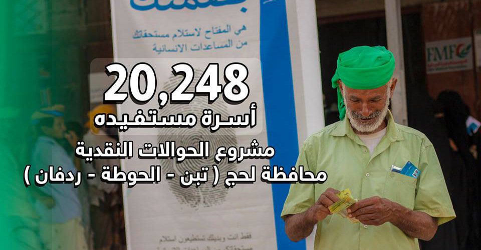 مشروع الحوالات النقدية محافظة لحج ( تبن – الحوطة – لحج )Admin29 أكتوبر، 2019يساهم مشروع الحوالات النقدية في دعم 20 الف و 248 أسرة شهرياً في مديريات تبن و ردفان و الحوطة بمحافظة ... اقرأ أكثر