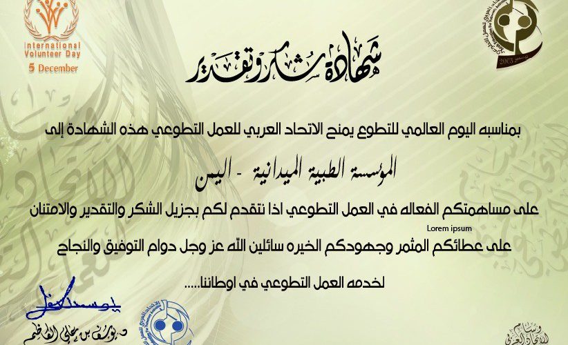 كرم الإتحاد العربي للعمل التطوعي المؤسسة الطبية الميدانية بمنحها شهادة شكر و تقدير نظير جهودها و أنشطتها التطوعيةAdmin10 ديسمبر، 2020كرم الإتحاد العربي للعمل التطوعي المؤسسة الطبية الميدانية FMF بمنحها شهادة شكر و تقدير نظير جهودها و أنشطتها التطوعية المتميزة ... اقرأ أكثر